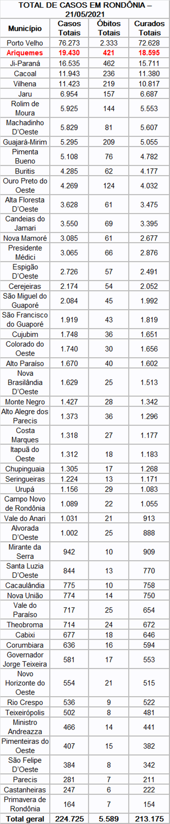 Nesta sexta-feira (21) foram registrados 25 óbitos por covid-19 no Estado, destes, 10 foram Ji-Paraná, sendo cinco mulheres (60, 52, 51, 39 e 37 anos de idade) e cinco homens (68, 64, 62, 60 e 57 de idade); quatro foram em Ariquemes, sendo três mulheres (73, 61 e 40 anos de idade) e um homem de 84 anos de idade; três foram em Pimenta Bueno, sendo uma mulher de 39 anos, e dois homens (69 e 66 anos de idade); dois foram de Cacoal, sendo os dois homens (68 e 44 anos de idade); um homem de 45 anos de Chupinguaia; um homem de 63 anos de Machadinho D’Oeste; uma mulher de 62 anos de Ouro Preto do Oeste; um homem de 46 anos de Porto Velho; um homem de 76 anos de São Francisco do Guaporé e um homem de 83 anos de Vilhena.