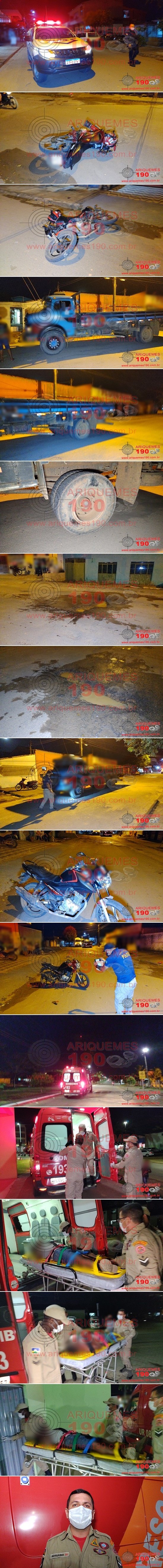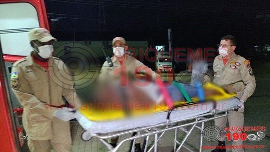 Na noite desta quarta-feira, 26/05, por volta das 19 horas, as Centrais do Corpo de Bombeiros Militar do Estado de Rondônia (CBMRO) e de Operações da Polícia Militar foram acionadas, para comparecerem na Rua Casemiro de Abreu do Bairro Colonial em Ariquemes/RO, pois teria ocorrido um acidente de trânsito. Rapidamente uma equipe do Corpo de Bombeiros, composta pelos socorristas: Sgt. Adriano, CB Leandro e CB Reis, juntamente com uma guarnição da Polícia Militar, composta pelos policiais: 3° Sgt. Alvaro, CB Odenilson e CB Barroso, se deslocaram até o local, onde ao chegarem, visualizaram um homem inconsciente, desorientado, o qual apresentava várias escoriações pelo corpo, cortes na região da face e perda parcial de um dedo. Imediatamente os socorristas iniciaram o Atendimento Pré-Hospitalar (APH) à vítima, imobilizando em prancha rígida e utilizando atadura na região do membro superior esquerdo. Após os procedimentos de primeiros socorros realizados ao homem, este foi conduzido para Unidade de Pronto Atendimento (UPA), para ser avaliado pela equipe médica de plantão. A Polícia Técnica compareceu no local para realizar os trabalhos de Perícia. No local pode ser apurado pela equipe de reportagens do Site Ariquemes190 e Canal 35.1 Digital que o acidente aconteceu, quando o condutor trafegava em sua motocicleta Yamaha/YBR pela Rua Casemiro de Abreu, momento em que ao desviar de um buraco na via, acabou perdendo o controle da direção do veículo, vindo a ocorrer a colisão com o pneu traseiro esquerdo do caminhão M.BENZ/L 1111, que transitava Rua sentido Av. Guaporé. O Boletim de Ocorrência Policial (BOP) foi registrado, para tomada de providências cabíveis.