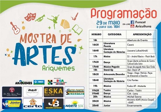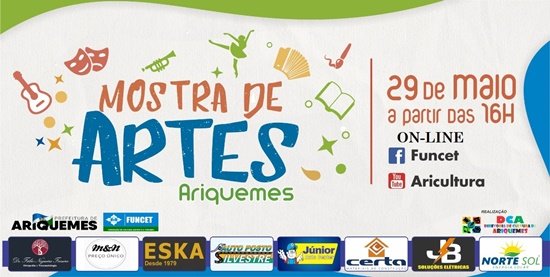 A Fundacão de Cultura, Esporte e Turismo-FUNCET, através da Diretoria de Cultura, tem o prazer de CONVIDAR toda a população para prestigiar A PRIMEIRA MOSTRA DE ARTES DE ARIQUEMES, que será realizada neste sábado dia 29/05/2021, a partir das 16hs. O evento acontecerá de forma on-line, no canal do do YOUTUBE: aricultura e pelo FACEBOOk da FUNCET.
