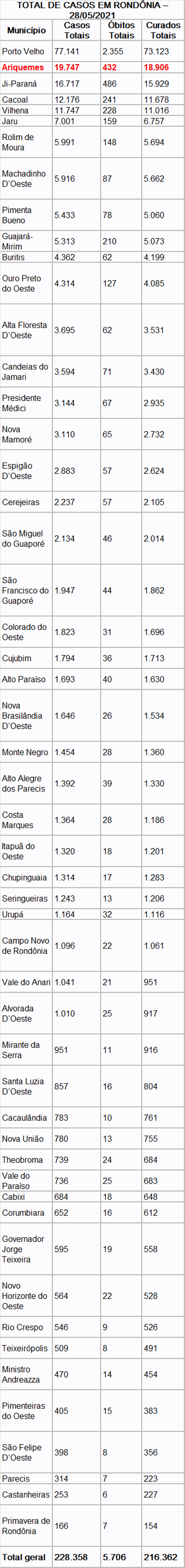 Nas últimas 24 horas foram registrados 27 óbitos por covid-19 em Rondônia, desses, sete foram em Porto Velho, sendo quatro mulheres (58, 41, 40 e 38 anos de idade) e três homens (78, 69 e 58 anos de idade); seis foram em Ji-Paraná, sendo uma mulher de 70 anos e cinco homens (88, 70, 59, 57 e 46 anos de idade); três em Vilhena, sendo uma mulher de 48 anos de idade e dois homens (58 e 36 anos de idade); duas mulheres (58 e 54 anos) de Ariquemes; dois em Pimenta Bueno, sendo uma mulher de 46 anos de idade e um homem de 36 anos de idade; uma mulher de 58 anos de idade de Alto Alegre dos Parecis; uma mulher de 73 anos de Candeias do Jamari; uma mulher de 62 anos de Cerejeiras; uma mulher de 63 anos de Guajará-Mirim; uma mulher de 55 anos de Nova Mamoré; um homem de 48 anos de Ouro Preto do Oeste e uma mulher de 66 anos de idade de Urupá.