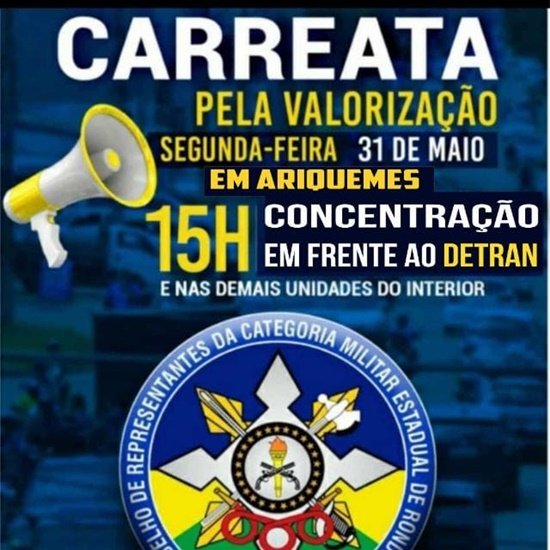 Os Policias Militares e Bombeiros de Rondônia, através de seus familiares e amigos devem realizar várias manifestações através de carreatas pelo Estado de Rondônia. A manifestação tem objetivo cobrar o Governador Marcos Rocha, que atenda as reivindicações das classes. O ato está marcado para o próximo dia 31 de Maio com concentração às 15h em frente aos batalhões e outros pontos como DETRAN. A cobrança tem ganhado força dos PMs, pois a classe votou em peso no Governador Marcos Rocha por ser Militar. Como é do conhecimento de todos, o mundo tem enfrentado um bombardeio de pessoas acometidas pelo Covid-19 e mesmo em meio a quarentena, a Segurança Pública manteve suas ações para atender a todas as chamadas. Muitos PMs faleceram e muitos foram contaminados, ficando com sequelas graves, já outros tiveram que retornar às atividades com sequelas leves.