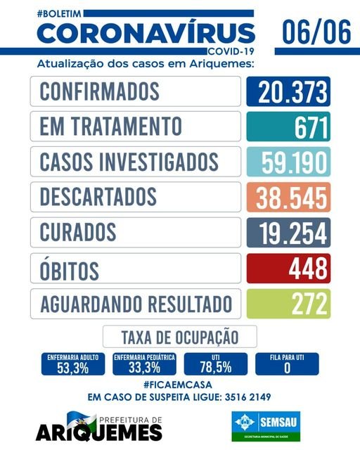 Um (01) óbito foi registrado neste domingo (06/06) - Boletim diário Coronavírus (Covid-19) de Ariquemes – Edição 431
