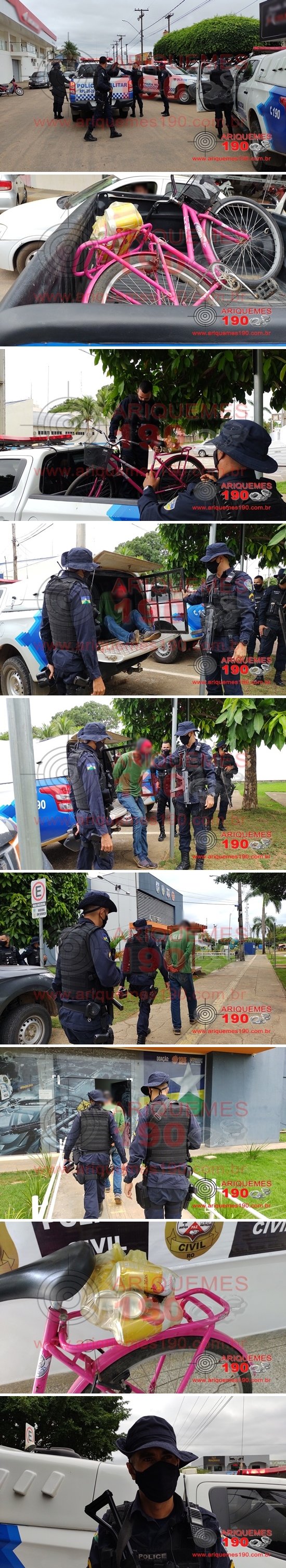 O fato ocorreu na tarde dessa sábado, 12/06, por volta das 14h30m, quando a guarnição da Polícia Militar denominada Patrulha Alpha, composta pelos Policiais Militares: CB Alencar e SD Guimarães, foi acionada através da Central de Operações do 7° BPM a comparecer na Avenida Tancredo Neves, Setor 03 em Ariquemes, onde populares estariam detendo um individuo que havia acabado de furtar uma bicicleta. Ali chegando os Policiais observaram que o elemento já estava sob custódia de alguns populares. Ao manter contato com a vítima, esta relatou que deixou sua bicicleta WRP, marca Genova de cor rosa, estacionada e descadeada, em frente ao Banco Bradesco. Quando retornou instantes mais tarde, notou que o meliante havia se apossado da sua bicicleta e em seguida se evadiu sentido Avenida Canaã. A vítima gritou pedindo por socorro, momento em que populares passaram a acompanhar o infrator, acabando por detê-lo. Mediante ao flagrante, o elemento foi apresentado nesta Unidade de Segurança Pública (UNISP) juntamente com a bicicleta, para registro do Boletim de Ocorrência Policial sob n° 83.329/2021, para posterior tomada de medidas cabíveis.