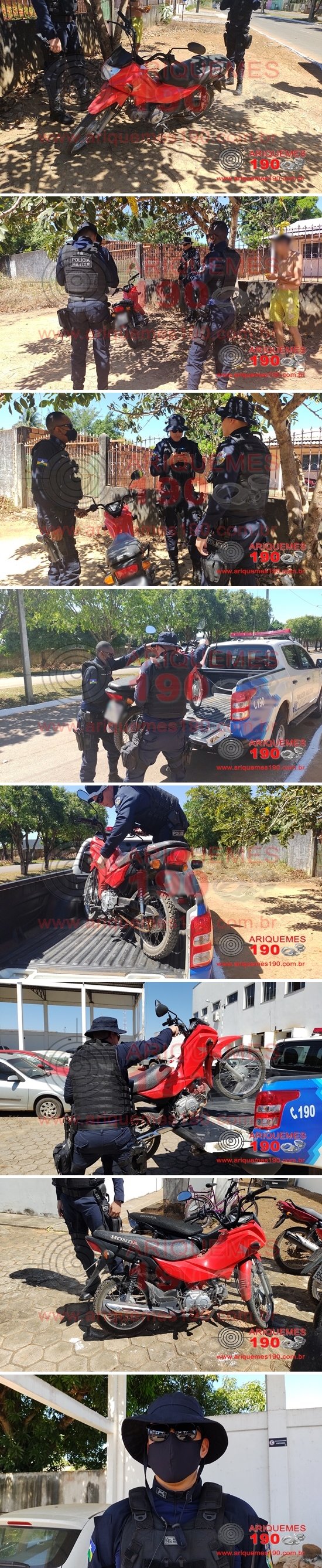 Um morador do Bairro Jardim Jorge Teixeira, Avenida Rio Branco em Ariquemes, ao sair de sua residência pela manhã para ir ao trabalho, avistou estacionada em frente a sua residência uma motoneta Honda Pop 110 de cor vermelha com placa de Ariquemes/RO. Ao retornar para sua residência para almoçar o morador observou que a tal motoneta ainda estava no mesmo local e achando estranho, chamou a Polícia. A Central de Operações do 7° BPM enviou ao local uma guarnição, que ao averiguar, constatou que tratava-se de um veículo roubado/furtado. O veículo havia sido subtraído no período da madrugada deste mesmo dia no Setor 03, onde a vítima havia percebido a subtração do mesmo ao acordar pela manhã, fato este narrado no Boletim de Ocorrência Policial n° 98.297/2021. Após a coleta dos dados necessários, o veículo foi conduzido ao pátio da Unidade de Segurança Pública (UNISP) para registo do Boletim de Ocorrência Policial sob n° 98.608/2021, para que após os trâmites necessários, o veículo seja restituído ao seu legítimo proprietário.