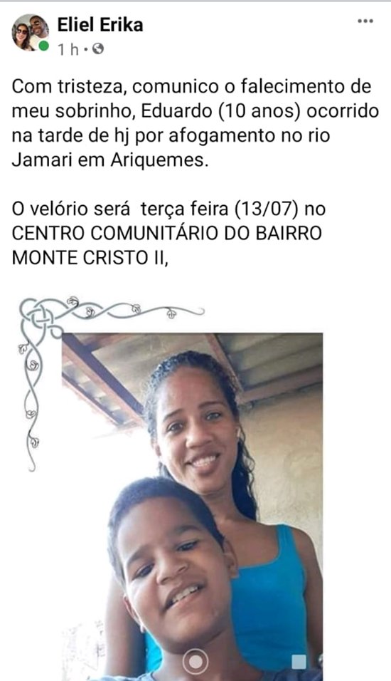 Muito triste a notícia do falecimento do garotinho Eduardo Gonçalves Santana, 10 anos em Ariquemes, ocorrido nesta segunda-feira, 12/07, por afogamento no Rio Jamari, no local conhecido como Sombra da Mata. Era por volta das 13h30m, quando familiares ligaram para o número de emergência do Corpo de Bombeiros (193), informando o desaparecimento e o possível afogamento da criança. Informações levantadas no local pela equipe de reportagens do Site Ariquemes190 e Canal 35.1 Digital, dão conta que familiares estavam tomando banho no rio e Eduardo tomava banho na beira do rio, juntamente com outra criança e não sabia nadar, quando foi visto rodando em um redemoinho no meio das águas. Algumas pessoas tentaram socorrer, obtendo êxito em conseguir resgatar a outra criança, porém, Eduardo não mais foi visto. A equipe do Corpo de Bombeiros esteve no local e iniciou as buscas, e após aproximadamente três horas de procura, localizaram o corpo da criança enroscado em uns galhos na beira do rio, metros abaixo do ocorrido.