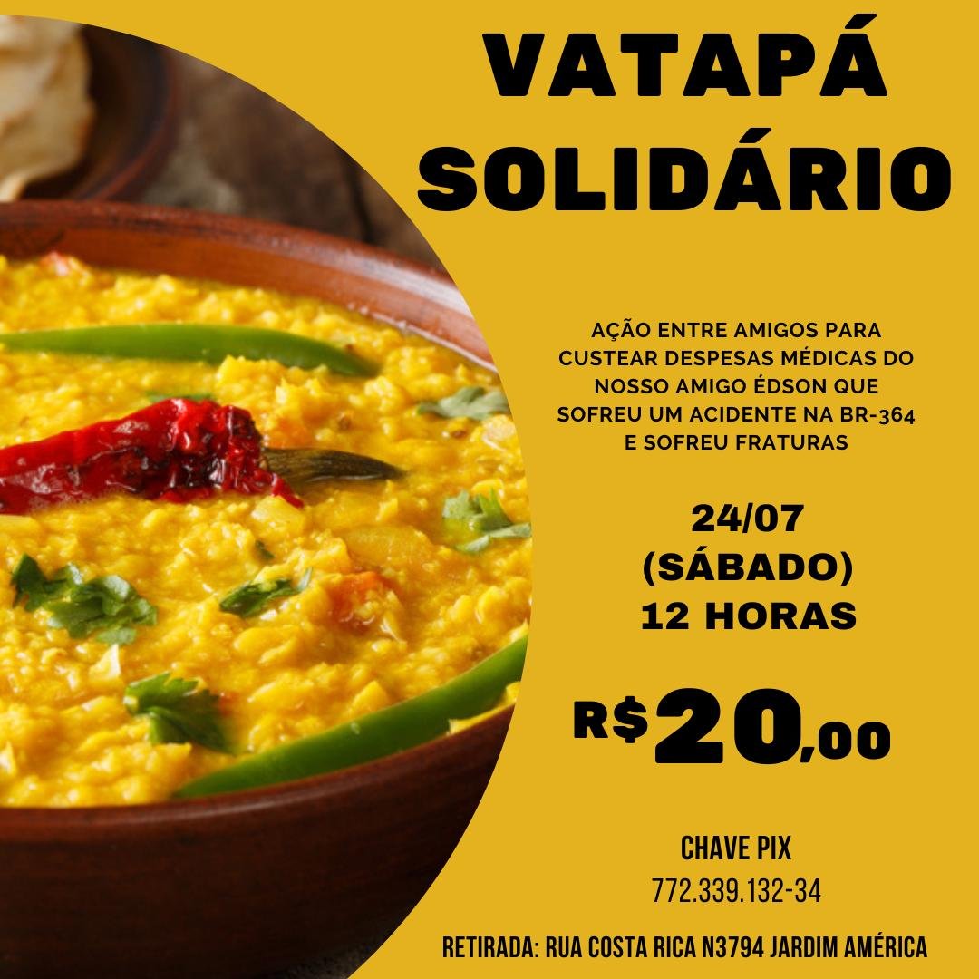 Família e amigos de Edson, vítima de um acidente de trânsito na BR-364, se reuniram para realizar um Vatapá em prol de pagar as despesas médicas do tratamento pós acidente. Edson sofreu fraturas após uma colisão com carro na manhã do dia 13/04/21. O vatapá acontecerá neste sábado 24/07, para retirar a partir das 11h30m na Rua Costa Rica n°3794 Jardim América. Será uma marmita de vatapá e uma de arroz no valor de R$ 20,00. Quem puder adquirir antecipadamente pode pagar através do PIX 772.339.132-34 (CPF) e enviar o comprovante no WhatsApp 9 9244-0381.