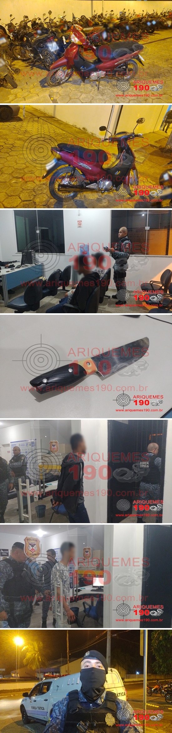 A Polícia Militar não está dando folga pra bandidagem! Em mais um belíssimo trabalho realizado pela Força Tática na noite dessa terça-feira, 03/08, resultou na recuperação de uma motoneta roubada e na condução de dois suspeitos à UNISP. Já era quase 23 horas, quando a guarnição da PM denominada Força Tática, composta pelos policiais: CB Hamer, CB P. Roberto, CB Diego Souza e CB Machula, realizava patrulhamento pela Rua Claudio Manoel da Costa com Ricardo Cantanhede, Setor 11 em Ariquemes, quando avistou dois elementos em uma motoneta Honda Biz de cor vermelha em atitude suspeita. Tendo conhecimento do roubo de uma Biz com as mesmas características, os policiais realizaram acompanhamento para abordagem, contudo, o condutor, percebendo que seriam abordados, entrou na Rua Heitor Villa Lobos no Setor 11, momento em que foi arremessado um objeto em direção a um muro. Os suspeitos foram alcançados já na Rua Claudio Manoel da Costa, esquina com a Rua Ricardo Cantanhede, local que foram abordados e foi realizada busca pessoal, contudo nada de ilícito foi encontrado. Ao ser indagado a respeito da motoneta, o condutor informou que seria de sua mãe, porém ao realizar consulta veicular ao sistema do Departamento Estadual de Trânsito (DETRAN), o veículo foi identificado como produto de Roubo, conforme Ocorrência Policial n° 113.462/2021. Na ocasião quatro elementos se jogaram à frente da moto quando a vítima transitava pela Av. Tancredo neves, próximo ao Hospital Regional e sob graves ameaças, subtraíram o veículo e a quantia de R$ 400,00. Ao ser confrontado com este fato, o mesmo afirmou ter pago a quantia de R$ 20,00 a um usuário de drogas para usar a moto. Diante do flagrante crime de Receptação, foi dada voz de apreensão ao menor de 17 anos de idade, e de Prisão ao maior de 24 anos. Ao retornar ao local onde foi visualizado arremessarem algo, foi localizada uma faca grande de cozinha, ao que tudo indica estavam à procura de uma vítima para efetuarem um roubo. Diante dos fatos foi registrado o Boletim de Ocorrência Policial sob n° 113.786/2021, para que sejam tomadas as medidas que o caso requer.