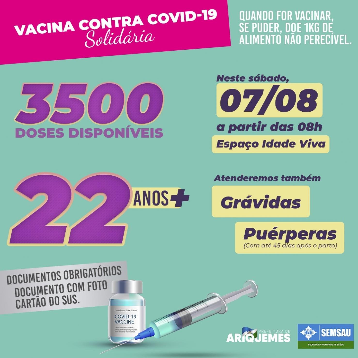 A Prefeitura de Ariquemes, por meio da Secretaria Municipal de Saúde – SEMSAU, em nova ação para proteger a população contra o novo coronavírus, baixa faixa etária e disponibiliza vacina contra covid-19, para imunizar com a primeira dose, pessoas com 22 anos ou mais.
