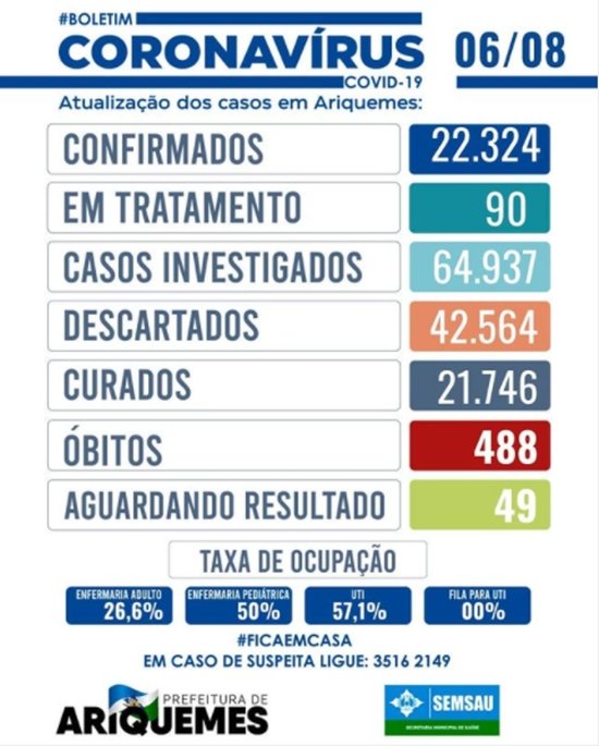 Até fechamento deste boletim, não houve registro de pacientes à espera por um leito de UTI em Ariquemes.