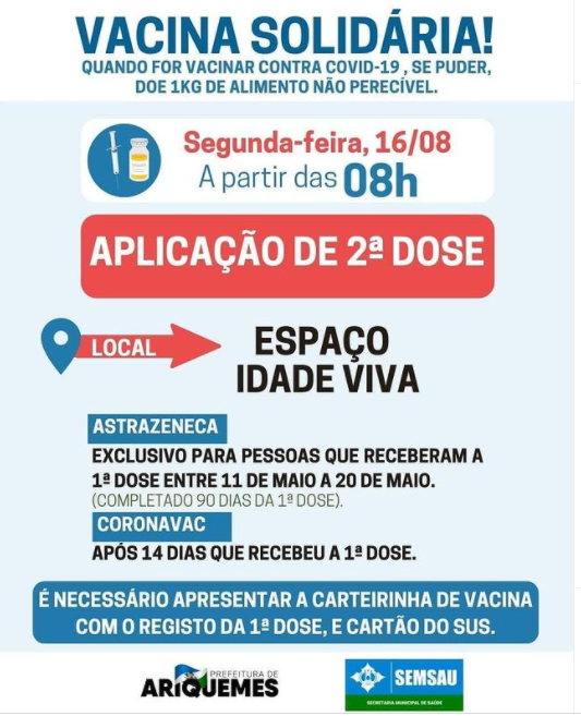 Se você está apto (a) para tomar a 2ª Dose, nos procure nesta segunda-feira, 16/08, a partir das 08h, no Espaço Idade Viva.