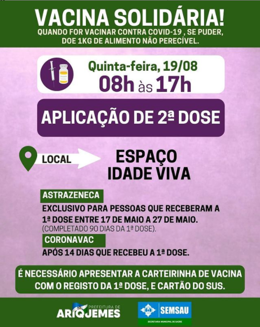 Se você está apto (a) para tomar a 2ª Dose, compareça nesta quinta-feira, 19/08, das 08h às17h, no Espaço Idade Viva.