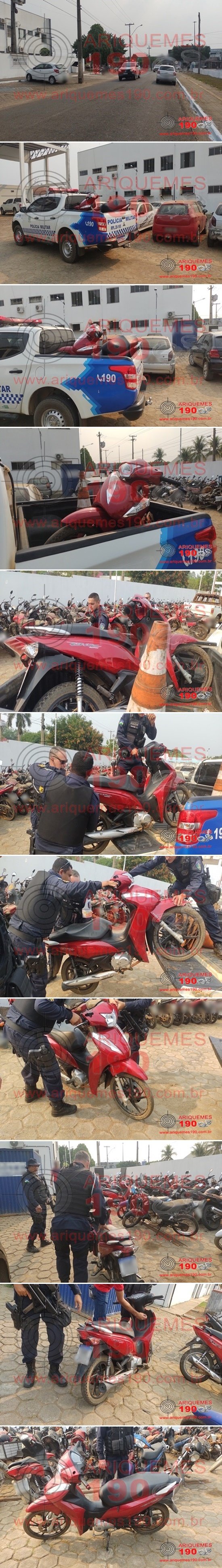 Era por volta das 14h20m dessa terça-feira, 24/08, quando a guarnição da Polícia Militar composta pelos policiais: Sgt. Oliveira e SD Joca, realizava patrulhamento ostensivo pelo Setor 09 em Ariquemes, quando foi abordada por um idoso, onde este informou à guarnição que teria visto uma motoneta abandonada em uma pedreira localizada na Via Bem-te-vi naquele mesmo Setor, e que possivelmente poderia ser produto de roubo/furto. A guarnição foi ao local indicado, onde encontrou o veículo Honda/Biz 125 de cor vermelha com placa de Ariquemes/RO, onde ao realizar consulta veicular ao sistema do Departamento Estadual de Trânsito (DETRAN), foi constatado que este teria sido furtado no Terminal Rodoviário em data anterior. Diante da confirmação, os policiais apresentaram a moto com restrição na Unidade de Segurança Pública (UNISP), para registro do Boletim de Ocorrência Policial, para a tomada de medidas cabíveis e posterior devolução do bem ao seu legítimo proprietário.