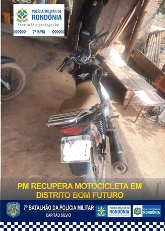 A Polícia Militar de Rondônia (PMRO), após denúncia, recuperou na tarde deste domingo, 22, no Distrito Bom Futuro – Ariquemes, uma motocicleta Honda CG 150 Fan que estava com restrição de roubo/furto.