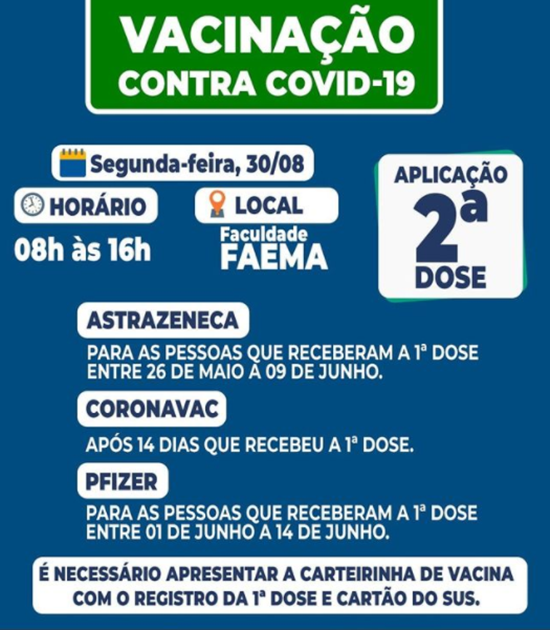 É necessário apresentar a carteirinha da de vacina com o registro da 1ª dose e o cartão do SUS.