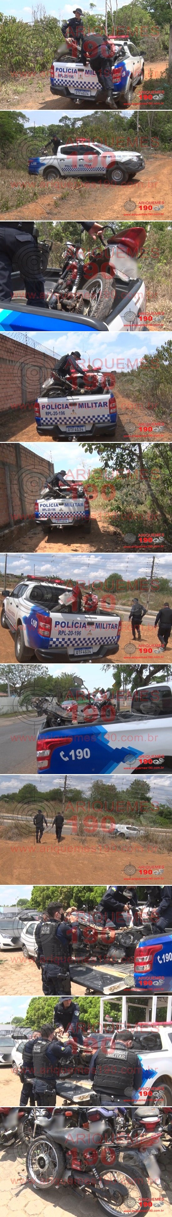 Na manhã desta sexta-feira, 04/09, por volta das 11h54m, a Central de Operação do 7° BPM recebeu uma denúncia anônima, a qual informava que atrás do Condomínio São Paulo em um terreno baldio no Bairro Eldorado em Ariquemes, estaria uma moto abandonada, parcialmente desmontada e com falta de algumas peças. Rapidamente foram enviadas até o local duas guarnições da Polícia Milita, onde ali chegando, os policiais confirmaram a veracidade da denúncia, encontrando a motocicleta Honda Titan CG 150 na cor vermelha com placa de Ariquemes/RO, a qual estaria parcialmente desmanchada, com muitas peças faltando e estava jogada próximo as árvores dentro da mata. Em seguida os policiais realizaram a consulta veicular juntamente com a Central de Operações, onde foi constatado que a motocicleta teria sido furtada. Mediante a confirmação, os policiais encaminharam a moto à Unidade de Segurança Pública (UNISP), onde foi realizado o registro do Boletim de Ocorrência Policial, para serem tomadas medidas posteriormente cabíveis e em seguida ser devolvido o bem para seu proprietário.