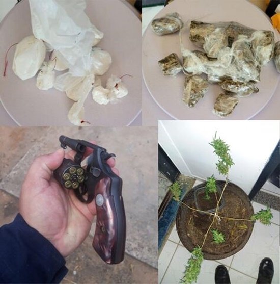 A abordagem foi realizada e encontrada no bolso do indivíduo, que é proprietário da casa e já foi preso pelo crime de tráfico de drogas, uma porção de entorpecente semelhante à cocaína. Dentro da sacola arremessada, havia várias porções de drogas análogas à maconha e cocaína, uma balança de precisão, munições de calibre .22 e calibre .32, além de algumas cápsulas deflagradas de calibre .32. Ainda, num terreno baldio, ao qual dá acesso a casa da denúncia, foram encontradas quatro plantas análogas à maconha.