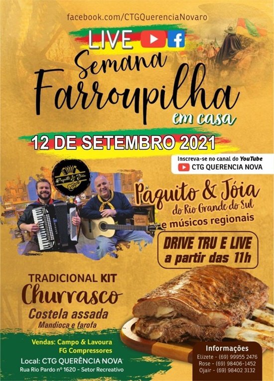 Rondônia é uma região que recebeu em sua colonização vários migrantes da região Sul, e junto com eles veio também as tradições do povo gaúcho, que são preservadas até hoje pelos CTGs. Em Ariquemes o Centro de Tradição Gaúcha (CTG) Querência Nova realiza todo ano uma semana de festividades para comemorar essas tradições. Nestes últimos anos, por motivo da pandemia, se tornou difícil a realização desta festividade, pois não podemos estar reunidos todos em só lugar para estar fazendo uma grande comemoração desta cultura tão amada. Pensando no melhor para nós o CTG Querência Nova em Ariquemes, estará promovendo neste domingo, 12/09, um grande Drive Tru, onde será servido uma deliciosa costela com acompanhamentos, tudo isso regado à uma excelente música gaúcha com a dupla Paquito & Jóia, que será transmitido em uma live no Canal Oficial do CTG Querencia Nova no YouTuber e no facebook, e também pelo Canal 35.1 Digial, a partir das 11 horas no domingo. Ainda dá tempo de adquirir o seu ticket pelos telefones: Elizete – (69) 99955-2476, Rose – (69) 98406-1452 ou Ojair – (69) 98402-3132. Venha prestigiar está live que será imperdível. Confira o vídeo.