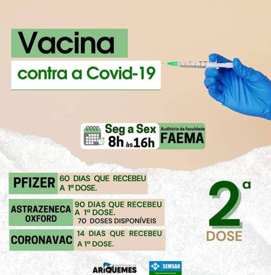 Astrazeneca/Oxford: 90 dias que recebeu a 1ª dose. (70 doses disponíveis).