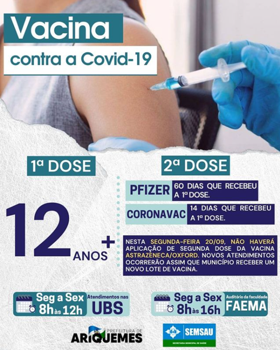Nesta segunda-feira 20/09, não haverá aplicação de segunda dose da vacina Astrazeneca/Oxford. Novos atendimentos ocorrerão assim que o município receber um novo lote de vacina.