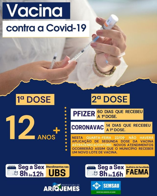 Nesta quarta-feira 22/09, não haverá aplicação de segunda dose da vacina Astrazeneca/Oxford. Novos atendimentos ocorrerão assim que o município receber um novo lote de vacina.