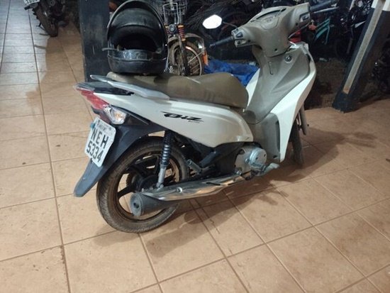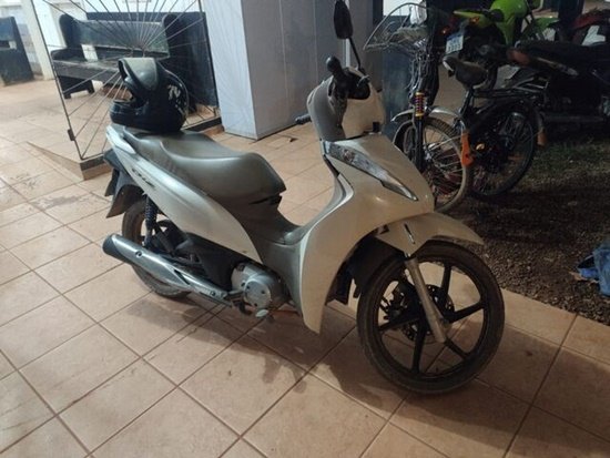 Quando a RP chegou ao local, visualizou a motocicleta da marca Honda modelo Biz 125 de cor branca e, nesse momento os policiais militares observaram a chegada de um indivíduo que se aproximou da motocicleta, colocou o capacete e quando ia saindo na motocicleta, foi abordado.