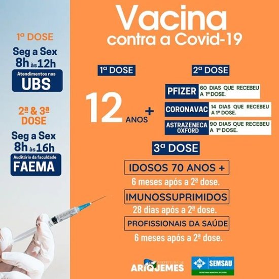 Ainda tem vacinação contra Covid-19 acontecendo em Ariquemes.