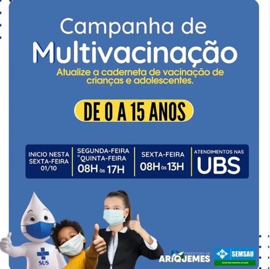 A Prefeitura de Ariquemes, por meio da Secretaria Municipal de Saúde (Semsau) iniciará na sexta-feira 01/10, a campanha de multivacinação para atualização da caderneta de vacinação de crianças e adolescentes.