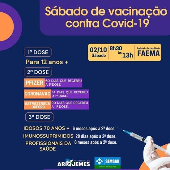 Atendimento para idosos com 70 anos ou mais, com intervalo de seis meses que recebeu a segunda dose. Deverá apresentar CPF, cartão do SUS atualizado e o comprovante de vacinação com a primeira e segunda dose.