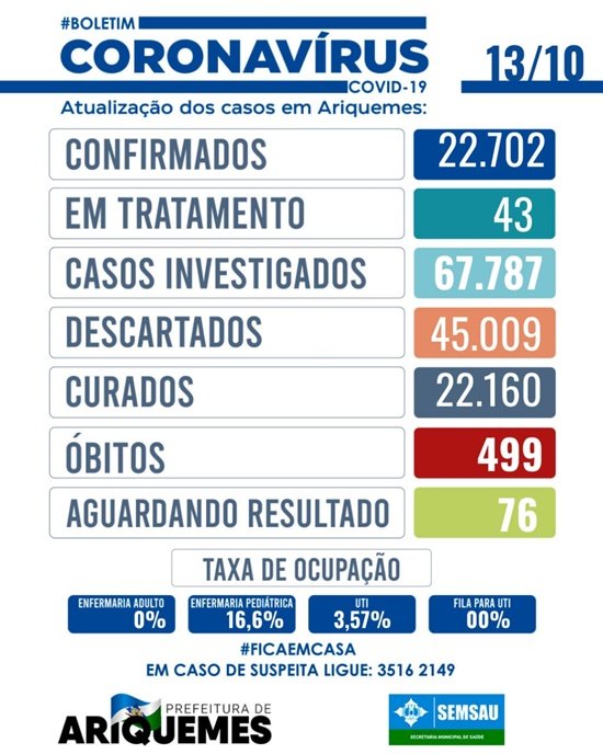 Até fechamento deste boletim, não houve registro de pacientes à espera por um leito de UTI em Ariquemes.
