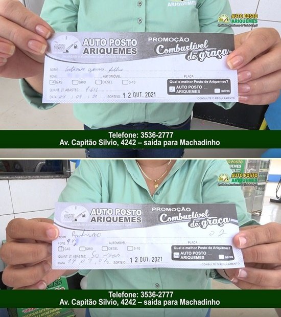 O Auto Posto Ariquemes está sempre presenteando seus clientes com a promoção Combustível de Graça. E neste mês de Outubro, o Auto Posto Ariquemes fez dois felizes ganhadores: Rodrigo que ganhou R$ 50,00 de combustível e Antônio Gomes que ganhou 9L de gasolina. Ao conceder entrevista ao Canal 35.1 Digital, a Empresária, proprietária do Auto Posto Ariquemes, Cristiane, fez um grande convite para você estar vindo abastecer e preencher o seu cupom para estar concorrendo ao sorteio no mês de Dezembro. Por que Combustível de Graças é só aqui no Auto Posto Ariquemes, que está localizado na Avenida Capitão Silvio, n° 4242, saída para Machadinho, com o telefone: (69) 3536-2777.