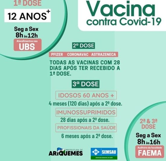 A Prefeitura de Ariquemes, por meio da Secretaria Municipal de Saúde – Semsau, seguindo a Portaria nº 165 da Agência Estadual de Vigilância em Saúde de Rondônia – AGEVISA, antecipará para 4 meses (120 dias) a aplicação da dose de reforço da vacina contra Covid-19, para as pessoas com idade igual ou superior a 60 anos.