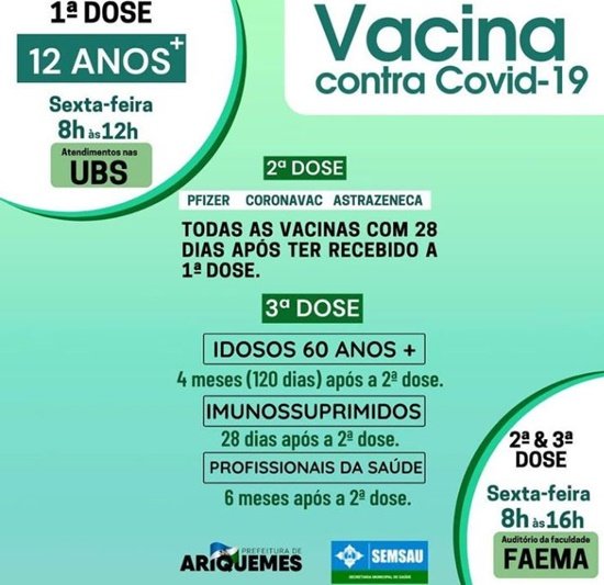 Primeira dose: Sexta-feira, das 8h às 12h, em todas as Unidades Básicas de Saúde (UBS).