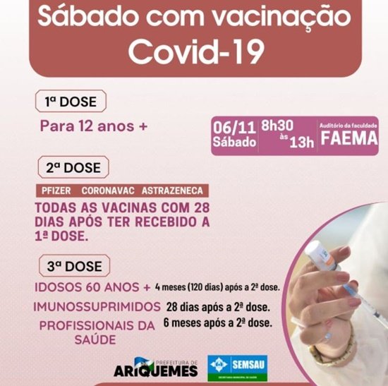 Neste sábado 06/11, das 8h30 às 13h, no auditório da Faculdade Faema, tem vacinação contra Covid-19.