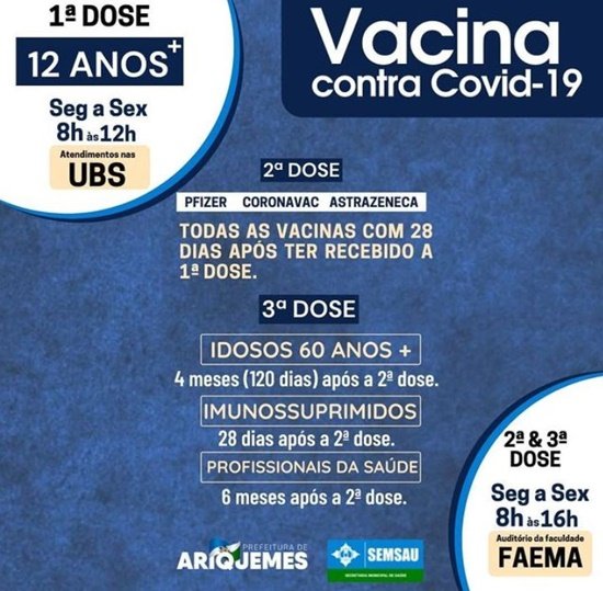 Segunda e terceira dose: De segunda a sexta-feira, das 8h às 16h, no auditório da Faculdade Faema.