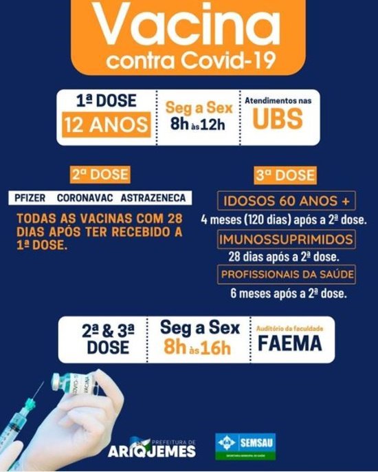 2ª e 3ª dose: De segunda a sexta-feira, das 8h às 16h, no auditório da Faculdade Faema.