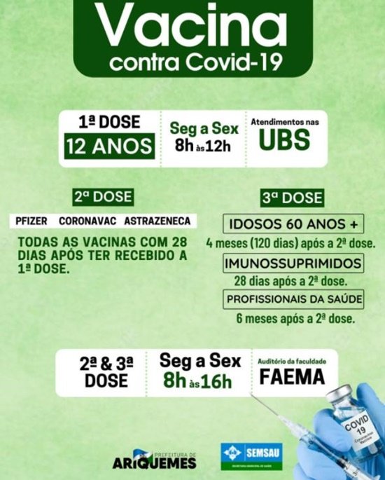 2ª e 3ª dose: De segunda a sexta-feira, das 8h às 16h, no auditório da Faculdade Faema.
