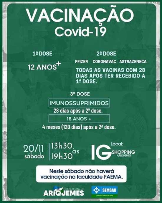 A Secretaria de Saúde informa que neste sábado não haverá vacinação na Faculdade Faema.