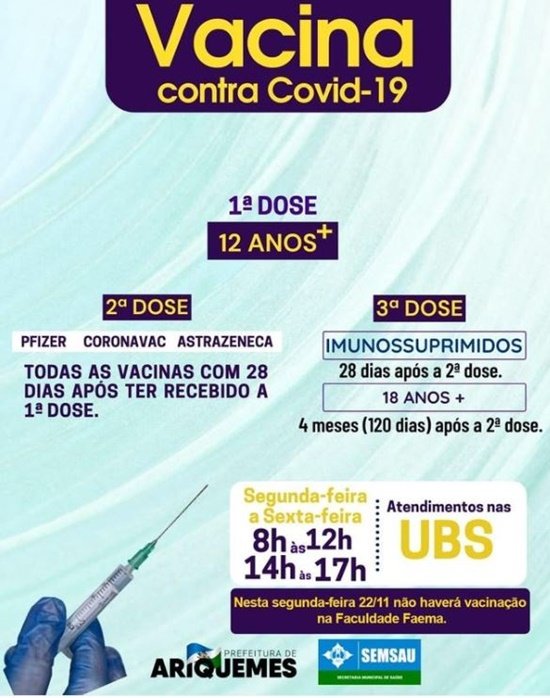 A Secretaria de Saúde informa que nesta segunda-feira 22/11, a vacinação contra Covid-19 continuará nas Unidades Básicas de Saúde (UBS).