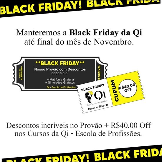 Não conseguiu se matricular nos descontos da Black Friday da Qi? Fique tranquilo, por que nós da Qi - Escola de Profisso?es pensamos em você decidimos manter ate? o final deste mês os descontos do Black Friday. Isso mesmo! Você que sonha em concluir seus estudos, essa pode ser sua grande chance. Confira o que preparamos para você: