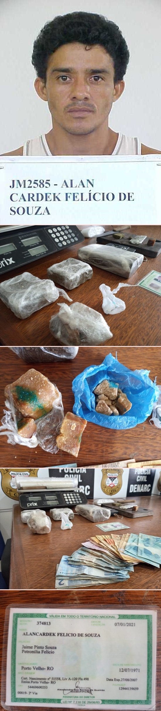 Policiais civis do Departamento de Narcóticos (Denarc) prenderam nesta segunda-feira (29), o acusado Alancardec F. S., 50, em uma residência na Rua Vila Mariana, na Zona Leste de Porto Velho, por tráfico de drogas. Segundo o Boletim de Ocorrência, o acusado, que é ex-presidiário por cometer dois homicídios no ano de 1990, foi flagrado com mais de um quilo de drogas, entre maconha e cocaína.