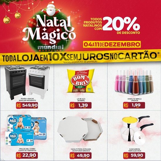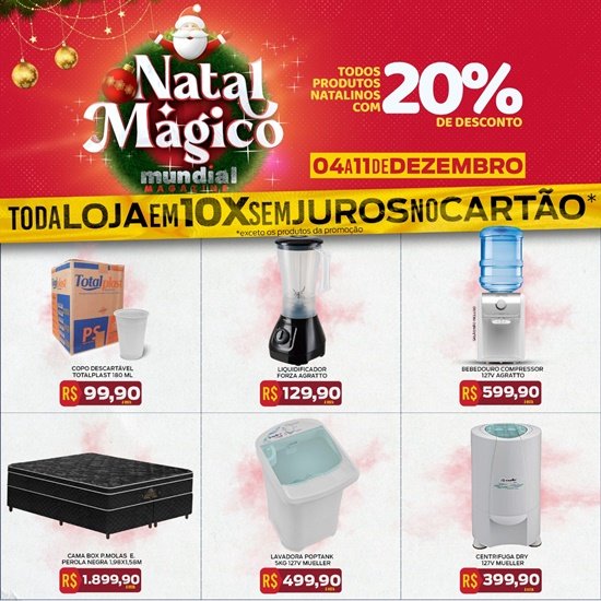 A Mundial Magazine está com uma super promoção para este dia 04 até 11 de Dezembro, com toda a loja em 10x sem juros no cartão exceto produto promocional. Para você decorar sua casa para este Natal, a loja esta com 20% de desconto em todos os produtos natalinos. Não vai ficar fora dessa vai? Venha para a Mundial Magazine que esta localizada na Avenida Jamari, n° 2820, em frente à Praça da Vitória – Aproveite as promoções. Mundial Magazine, tudo o que há de melhor em um só lugar. Confira as promoções: