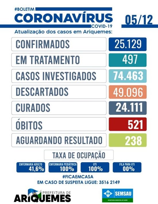 Até fechamento deste boletim, não houve registro de pacientes à espera por um leito de UTI em Ariquemes.