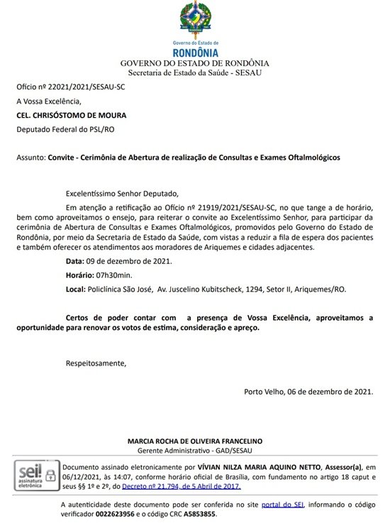 Com recurso federal de “um milhão” de reais enviado pelo deputado Coronel Chrisóstomo ao governo do estado de Rondônia será dado os procedimentos nos atendimentos de exames e cirurgia oftalmológicas, e no dia 09 de dezembro, 2021 será a cerimônia de abertura que acontecerá em Ariquemes, na Policlínica São José, avenida Juscelino Kubitschek, 1294, setor 02 a partir da 7:30 horas.