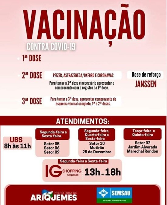 As UBS do Setor 10 e dos bairros 25 de Dezembro e Mutirão, a vacinação ocorrerá as segundas, quartas e sextas-feiras, das 8h às 11h.