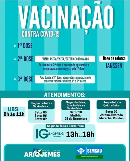 As UBS do Setor 10 e dos bairros 25 de Dezembro e Mutirão, a vacinação ocorrerá as segundas, quartas e sextas-feiras, das 8h às 11h.