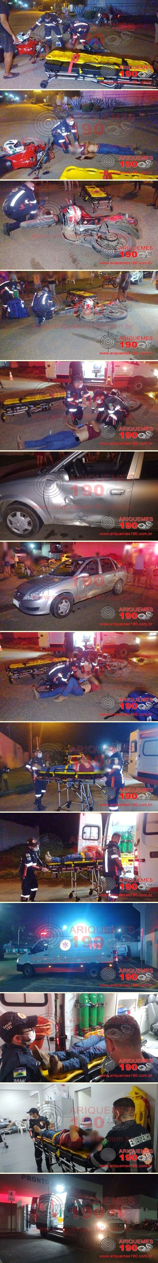 Era por volta 21 horas quando a Central de Operação do 7° BPM, junto da Central do Serviço de Atendimento Móvel de Urgência (SAMU), foram acionadas a comparecerem na Rua MARABÁ, 3252, Jardim Jorge Teixeira em Ariquemes, para atenderem uma ocorrência de acidente de trânsito envolvendo uma moto e um carro, sendo que o motociclista encontrava desacordado. De pronto foram enviadas ao local uma guarnição da Polícia Militar, concomitantemente com uma Unidade de Suporte Básico (USB) do SAMU, onde ali chegando, os policiais e socorristas puderam constatar a veracidade da informação, sendo que o homem já havia retomada a consciência e apresentava um curte na região da cabeça, uma lesão no braço direito, onde havia suspeita de fratura. Rapidamente os socorristas iniciaram o atendimento pré-hospitalar à vítima, imobilizando o braço com suspeita de fratura, imobilizando também o homem em prancha rígida, com colar cervical, sendo em seguida encaminhado ao Hospital Municipal de Ariquemes (HMA), onde ficou sob os cuidados da equipe médica de plantão. De acordo como narra o Boletim de Ocorrência Policial, o homem trafegava pela Rua Marabá, em sua motocicleta marca Honda, modelo CG Fan 150, cor vermelha, com placa de Ariquemes/RO, seguindo sentido ao cruzamento com a Rua Ecoara, enquanto pela Rua Ecoara trafegava uma condutora em seu veículo Chevrolet Classic, cor prata, com placas de Ariquemes/RO, seguindo para o cruzamento com a Rua Marabá, momento que no cruzamento houve a colisão lateral, ocasionando a queda e os ferimentos da vítima. O carro ficou com avarias na parta lateral esquerda do motorista, sendo que a moto ficou com a frente danificada. Após coleta de informação, os policiais realizaram o registro do Boletim de Ocorrência Policial sob nº 193458/2021, para serem tomadas medidas posteriormente cabíveis.
