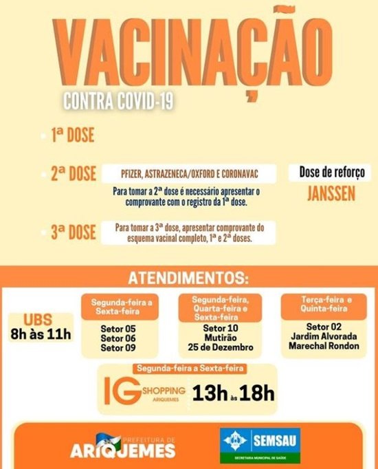 As UBS do Setor 10 e dos bairros 25 de Dezembro e Mutirão, a vacinação ocorrerá as segundas, quartas e sextas-feiras, das 8h às 11h.