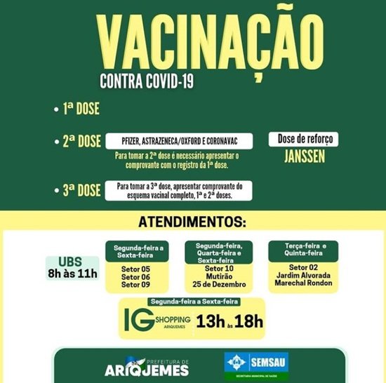 As UBS do Setor 10 e dos bairros 25 de Dezembro e Mutirão, a vacinação ocorrerá as segundas, quartas e sextas-feiras, das 8h às 11h.