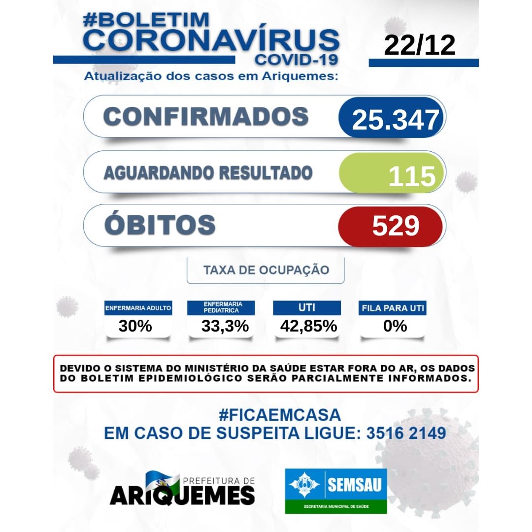Até fechamento deste boletim, não houve registro de pacientes à espera por um leito de UTI em Ariquemes.