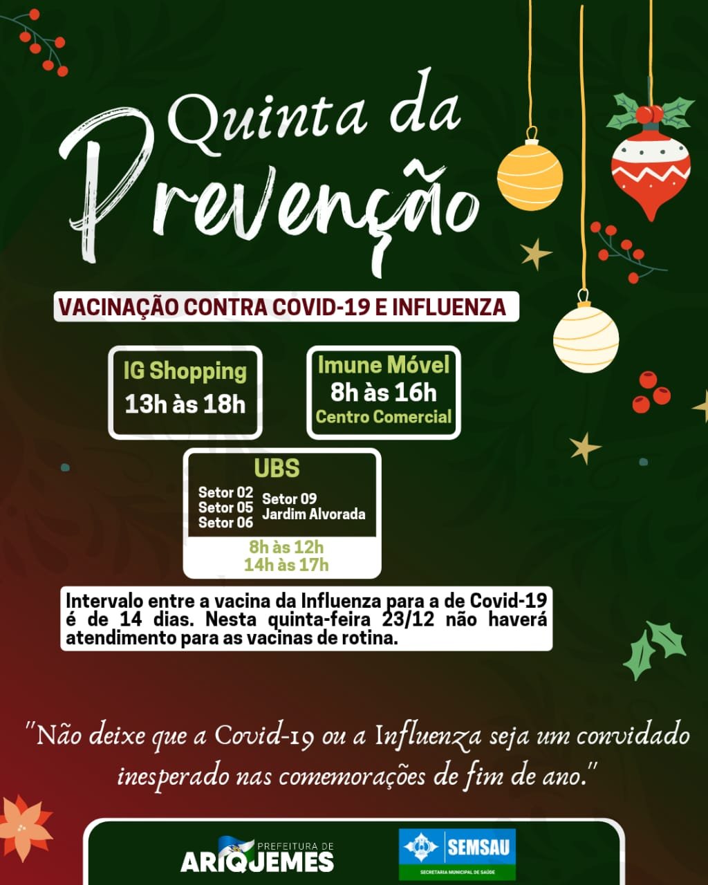 Com o objetivo de aumentar a proteção da população contra a Influenza e a Covid-19, a Secretaria Municipal de Saúde – Semsau, realizará nesta quinta-feira 23/12, mais uma campanha de vacinação em Ariquemes.